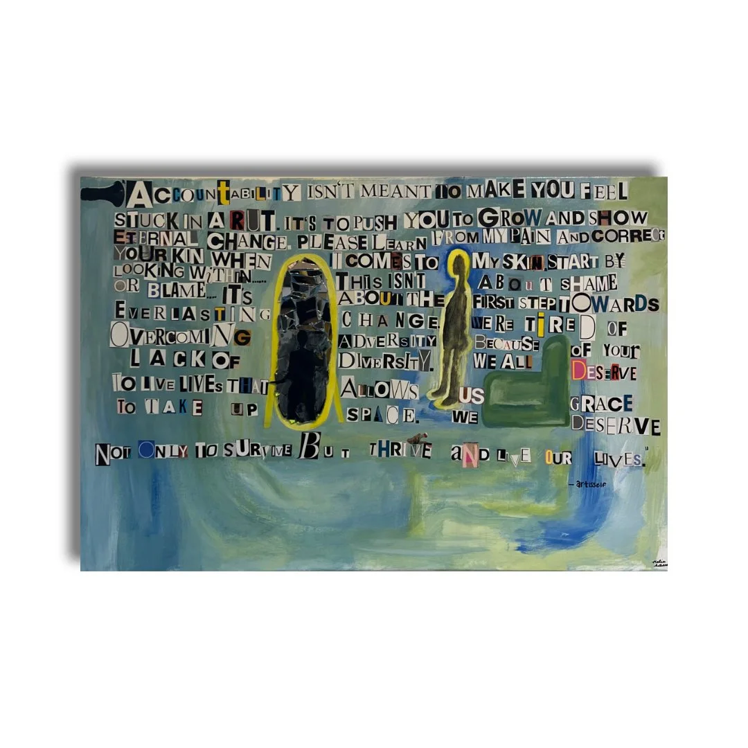 Immerse yourself in exploring identity and societal truths with Shadow Work. This captivating mixed-media painting blends bold colors and thought provoking text to confront the complexities of racism head-on.